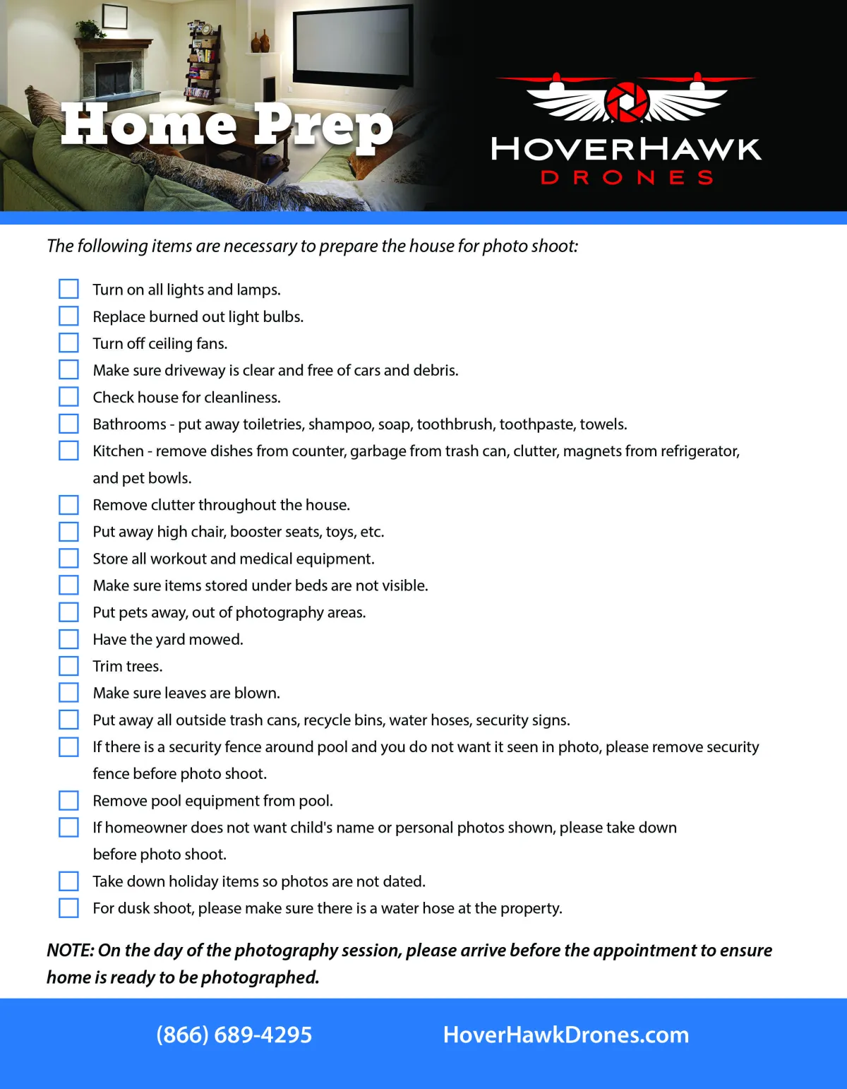 After setting an appointment with Hover Hawk Drones, please review the home preparation flyer to ensure your property is ready for the photo shoot. Here you will see all those requirements for photography.